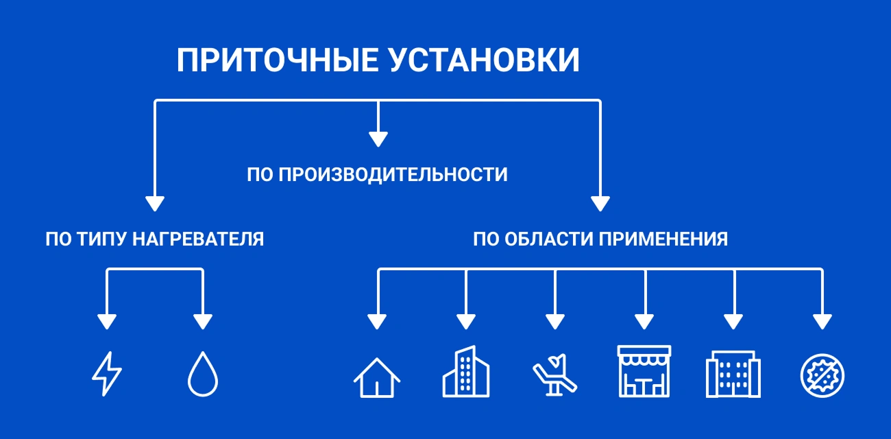м³/ч ). По ней определяют, какой объём воздуха оборудование может подать на объект. Приточную установку необходимо подбирать в зависимости от размера помещения, требований к воздухообмену и количества людей, находящихся в комнатах. - Область применения. Вентмашины могут быть предназначены для различных типов объектов, включая жилые, коммерческие и промышленные. Например, для небольшой квартиры хватит самой маленькой установки, но для медицинского учреждения оборудование с такой производительностью и стандартной степенью очистки воздуха не подойдёт — потребуется высокая фильтрация. Поэтому оборудование нужно подбирать под конкретные требования помещения.