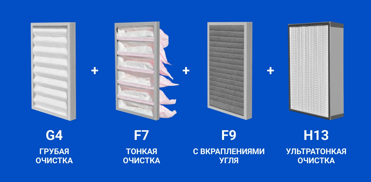 Такой высокий показатель достигается за счёт использования целой цепочки из четырёх типов фильтров: G4+F7+F9+H13. Последний из перечня используют в фармацевтике и электронной промышленности, так как именно он останавливает самые маленькие частицы загрязнений.